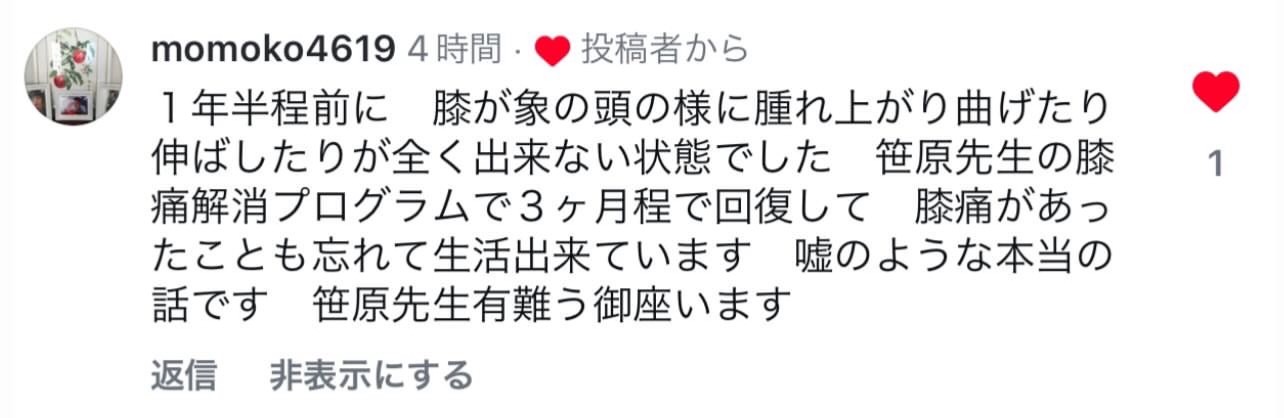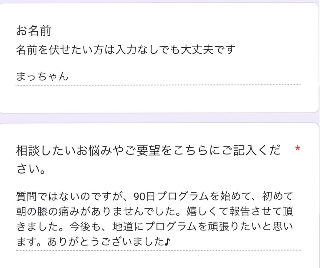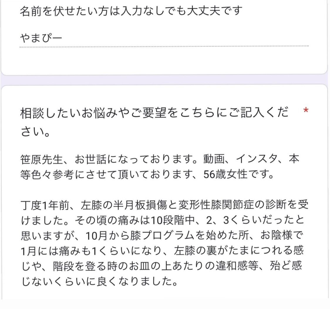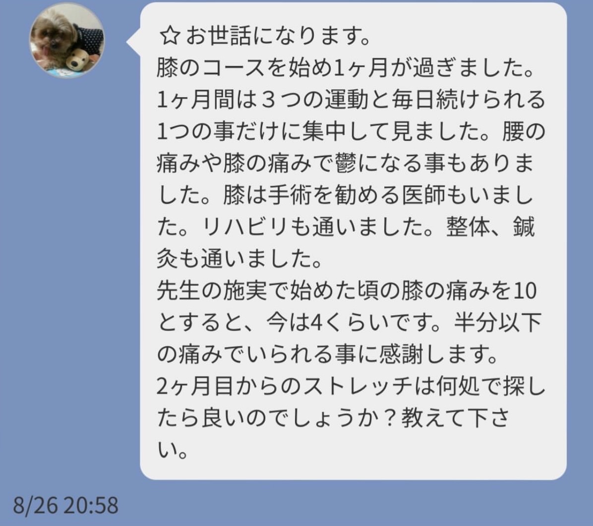 膝の痛みの度合いが10段階中1になり、膝裏のつる感じや、お皿の上の違和感がほどんど感じなくなりました