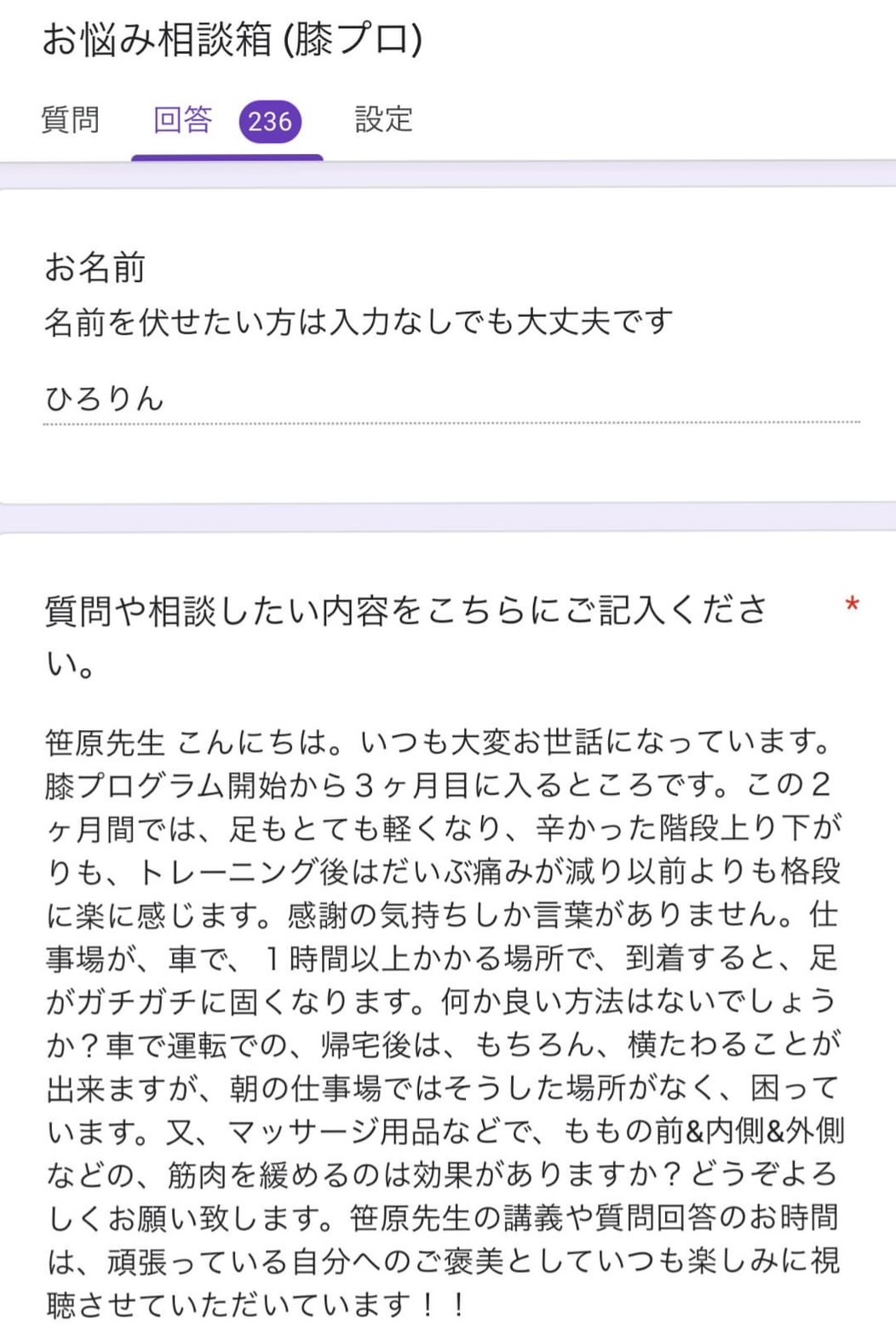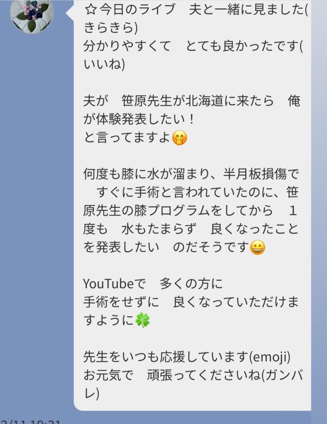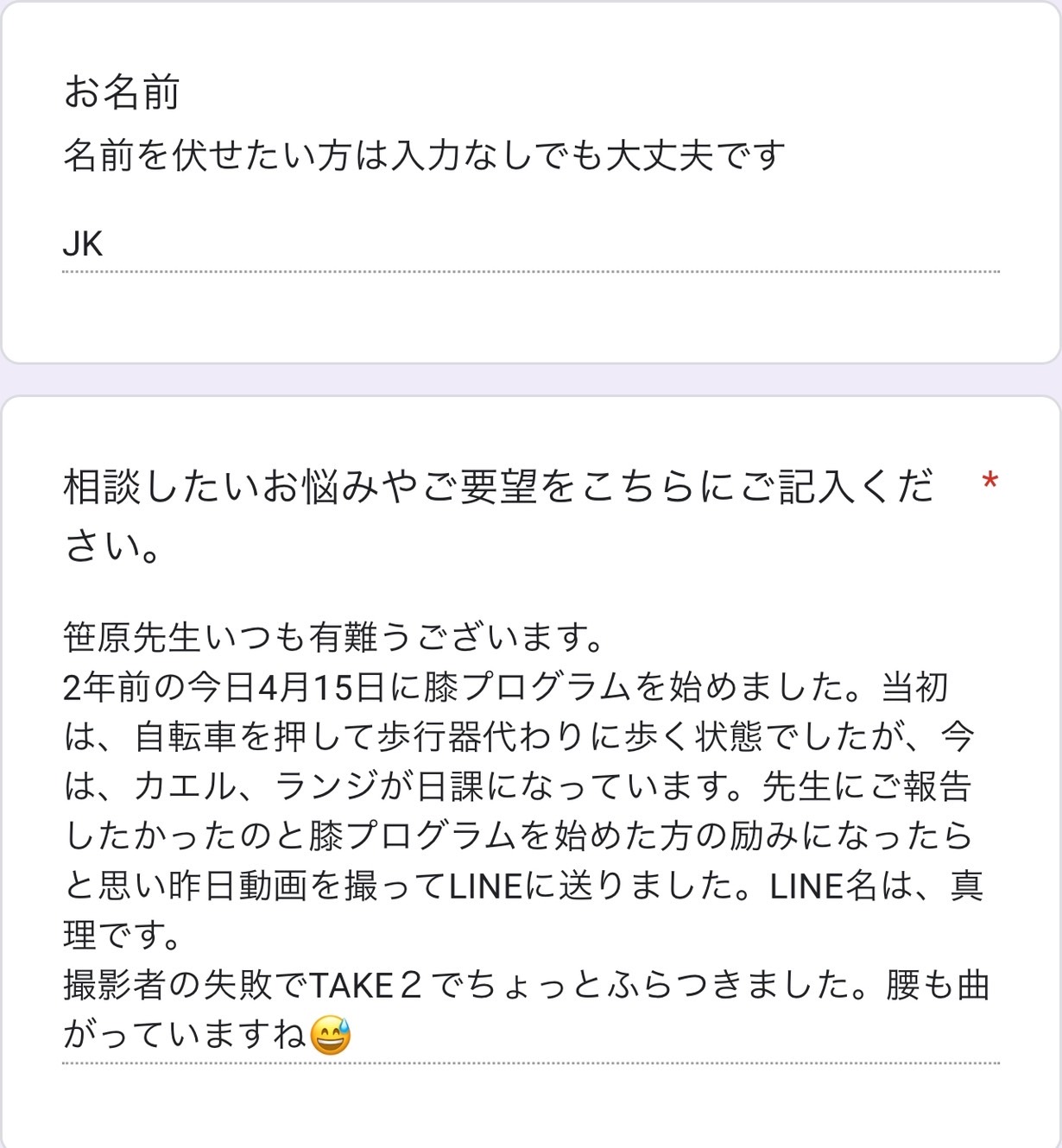 膝の痛みの度合いが10段階中1になり、膝裏のつる感じや、お皿の上の違和感がほどんど感じなくなりました